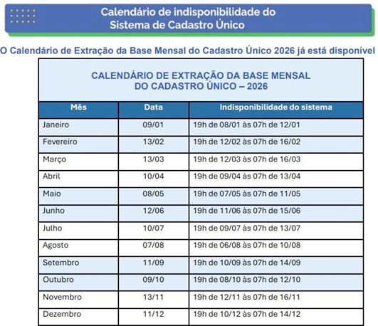 Segundo a Semias, o calendário é elaborado e divulgado pelo Ministério do Desenvolvimento e Assistência Social, Família e Combate à Fome (MDS) e pode sofrer alterações ao longo do ano, conforme necessidade técnica do sistema.