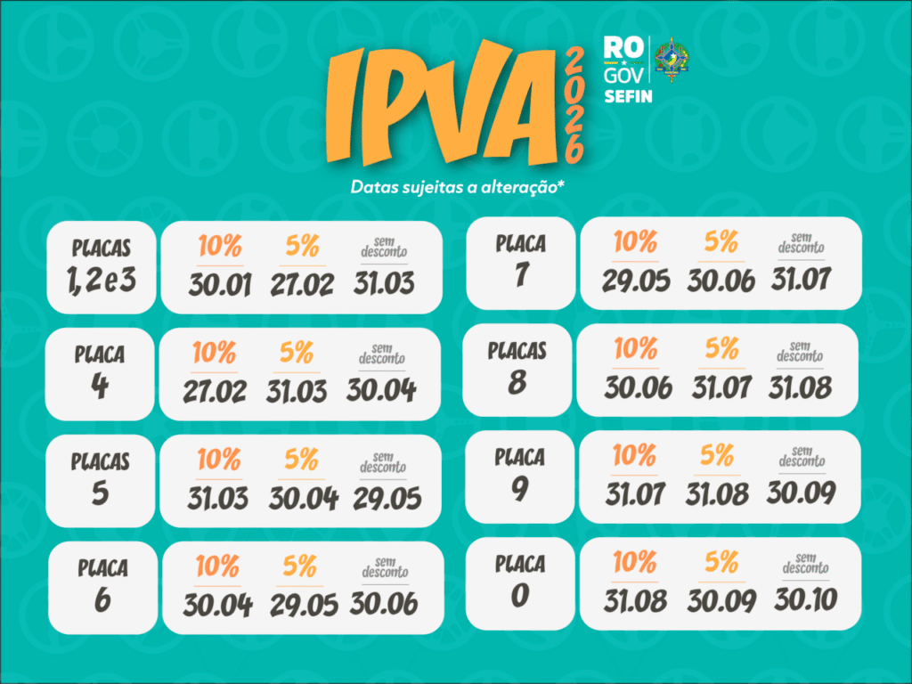 O governo de Rondônia, por meio da Secretaria de Estado de Finanças (Sefin), divulgou o calendário de pagamento do Imposto sobre a Propriedade de Veículos Automotores (IPVA) 2026. Os prazos são escalonados conforme o número final da placa do veículo e contemplam opções de quitação antecipada com descontos para os contribuintes.