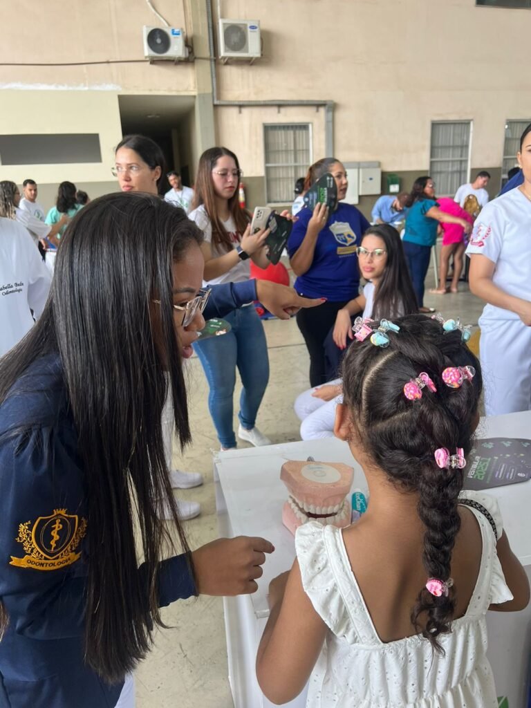 Odontologia (Faculdade Metropolitana): orientações sobre escovação correta e cuidados com a saúde bucal, especialmente para crianças, que receberam dicas práticas para manter os dentes saudáveis.