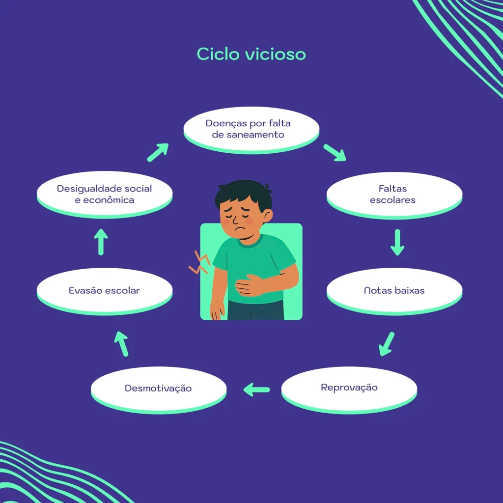 No Brasil, cerca de 28,8 milhões de crianças e adolescentes de até 17 anos vivem na pobreza e, entre eles, 5,4% sofrem com a privação de água e 38% não têm acesso à rede de esgoto. Esses índices do Fundo das Nações Unidas para a Infância (Unicef) comprovam como a falta de acesso aos serviços gera reflexos no desempenho escolar e na perpetuação da pobreza. A relação direta entre saneamento e desigualdade social é reforçada pela realidade do nosso país: de acordo com o IBGE (2022), 8 em cada 100 pessoas em situação de pobreza no Brasil moram em habitações sem banheiro.